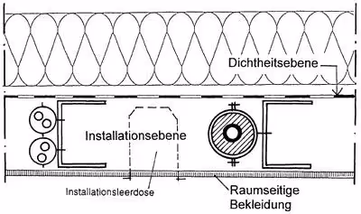 Bei den nachfolgenden Innenausbauarbeiten dürfen die Bemühungen um eine luftdichte Konstruktion natürlich nicht wieder zunichte gemacht werden. Nicht selten wird die Wind- und Dampfsperre nämlich aus Unkenntnis über die komplizierten bauphysikalischen Zusammenhänge erst nachträglich verletzt. Der Einbau von Steckdosen ist hier nur einer von vielen Anlässen für mögliche Beschädigungen. Mit einer Installationsebene, die raumseitig vor der Luftdichtheitsschicht angeordnet wird, können Durchdringungen von vornherein vermieden werden (s. Abb. 16).
