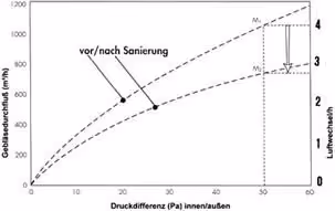 Weitere Prüfverfahren sind der Übersicht zu entnehmen. Die Abb. 18 zeigt ein Beispiel einer Blower-Door-Messreihe (vor und nach der Sanierung).
